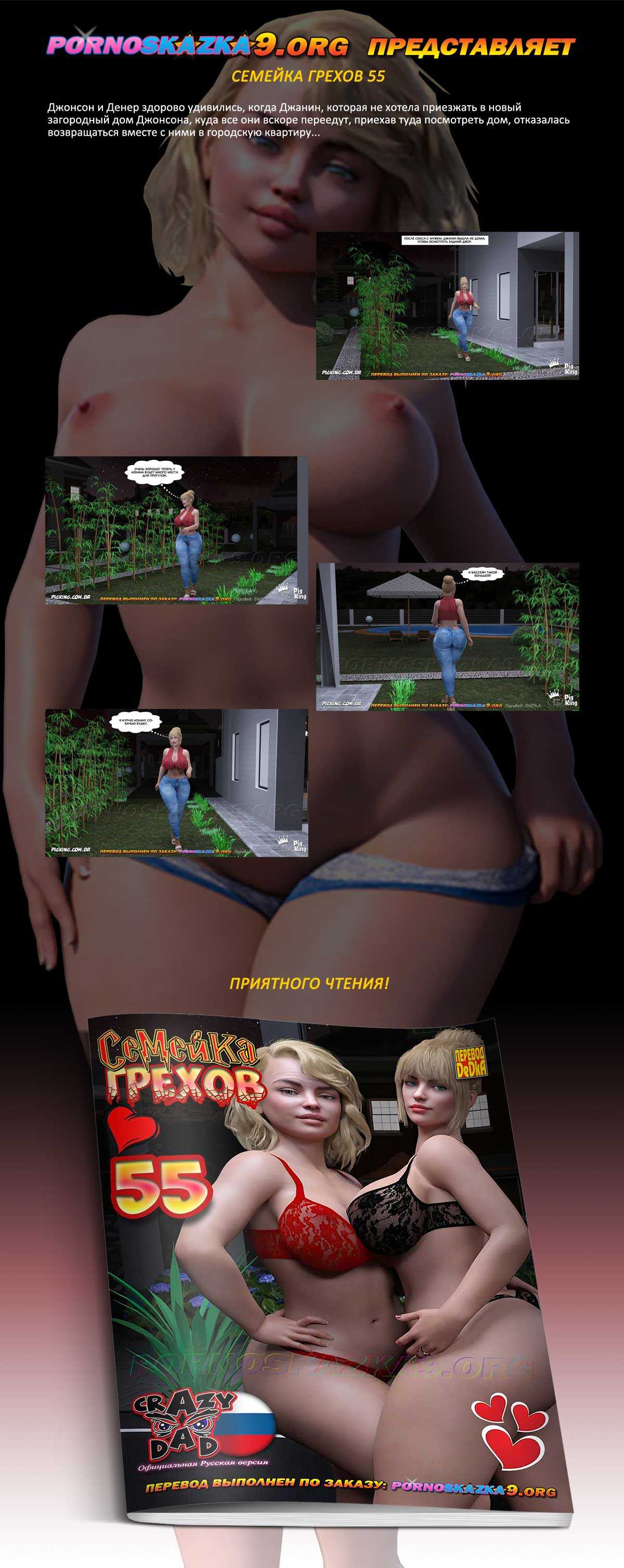 Порно комикс «Семейка грехов. Часть 55». Джонсон и Денер здорово удивились, когда Джанин, которая не хотела приезжать в новый загородный дом Джонсона, куда все они вскоре переедут, приехав туда посмотреть дом, отказалась возвращаться вместе с ними в городскую квартиру…